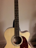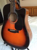 I love the action of this guitar. It bars almost like a full electric. And the woodwork is beautiful. This is also my first acoustic-electric.
